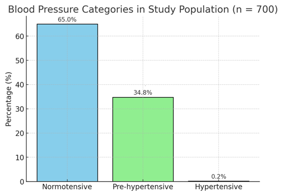 Mean SBP: 118,48 ± 8,15 mmHg, Mean DBP: 78,46 ± 5.96 mmHg. A majority of participants (65 %) were normotensive. Pre-hypertension constituted ~ 35 %, indicating a significant at-risk population for future hypertension. Hypertension prevalence (0,02 %) was very low, likely due to the predominantly young population in the study.