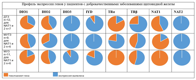 Установлены различия в экспрессии NAT1 и NAT2 в тиреоидной ткани при доброкачественных заболеваниях. При всех вариантах заболевания экспрессируется NAT2, экспрессия NAT 1 выявляется значительно реже при всех вариантах заболевания.