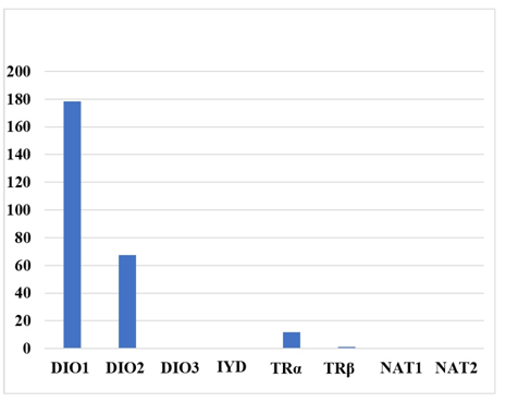 Из данных этой таблицы видно, что наиболее активным геном в ткани щитовидной железы был ген DIO1, в 2,6 раз слабее экспрессировался DIO2, а DIO3 не анализировали. Экспрессия TRα была в 11,67 раз, а TRβ – в 129,7 раз ниже, по сравнению с DIO1. Активность гена NAT1 находилась на низком уровне, а ген NAT2 не был исследован (рисунок 4).
